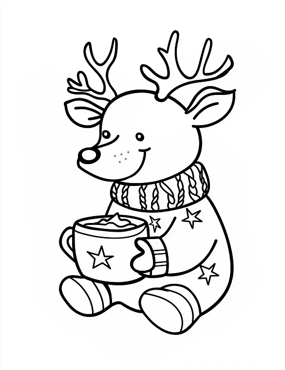 The charming reindeer enjoying hot cocoa coloring page celebrates the quiet joys of winter. With a reindeer holding cocoa, it creates a calm and festive atmosphere perfect for holiday relaxation.