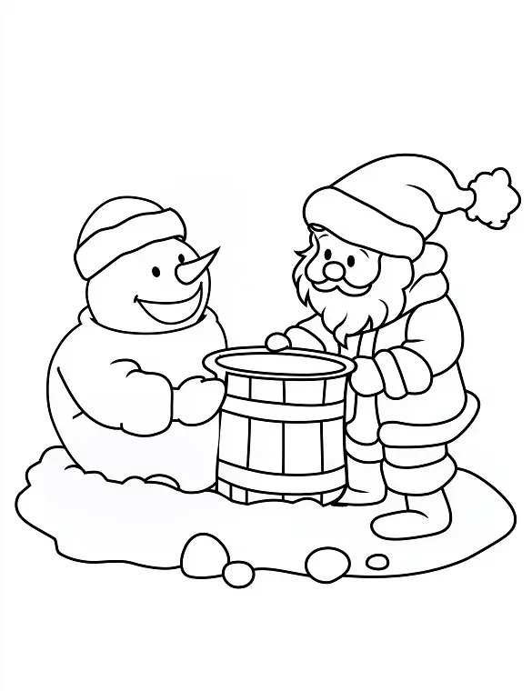 This cute Santa building snowman with bucket coloring page is perfect for children and adults alike. It’s simple enough for young artists and relaxing for older ones looking for mindful coloring.
