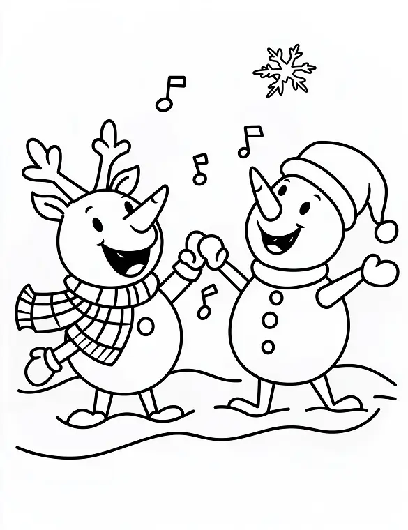 The dancing reindeer and snowman Christmas coloring page is perfect for group activities. Families can share laughter while coloring together, mixing bold and bright shades.