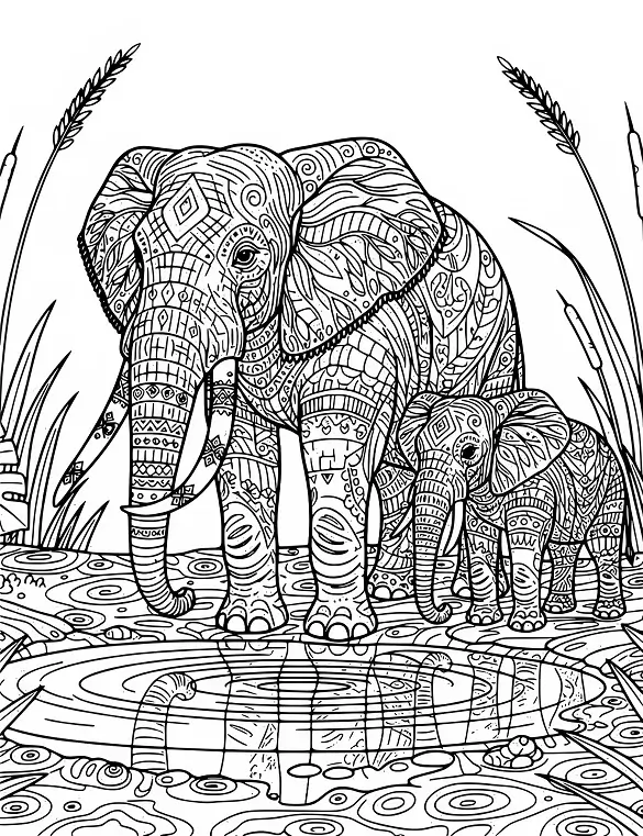 Ornate Elephant Family at Waterhole Coloring Page by Mindset Flow