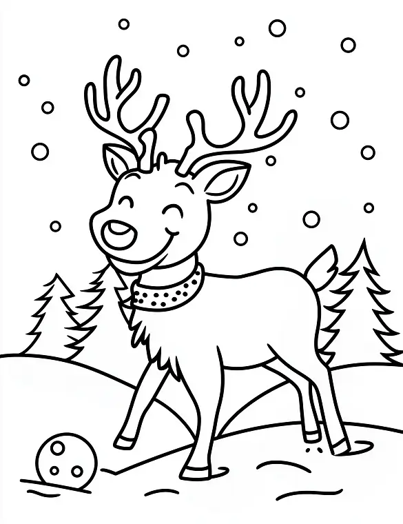 Enjoy a snowy adventure with a playful reindeer in this fun and festive coloring page.