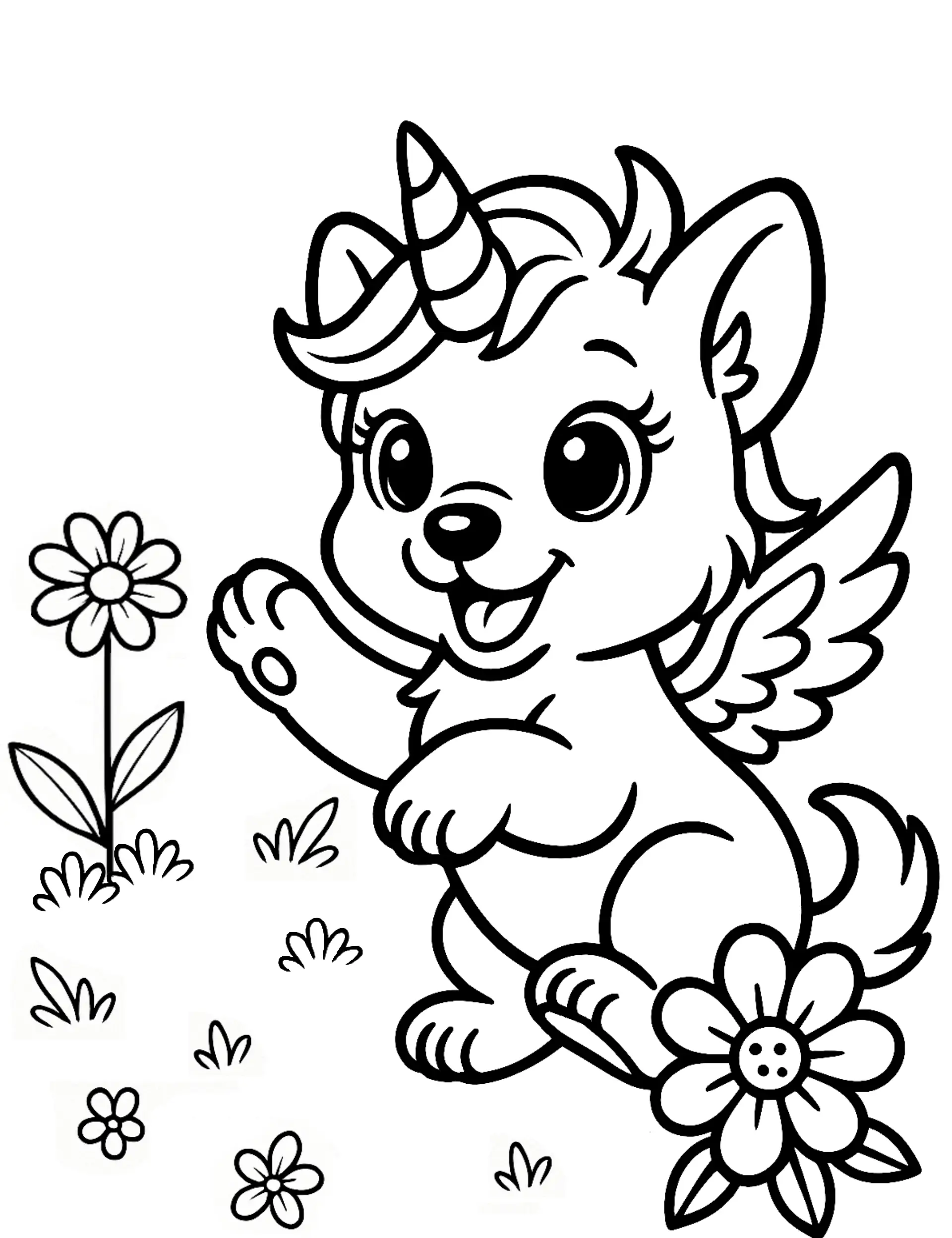 - The Unicorn Puppy Coloring Page is a unique and magical design, combining the cuteness of a puppy with the whimsy of a unicorn and vibrant flowers.