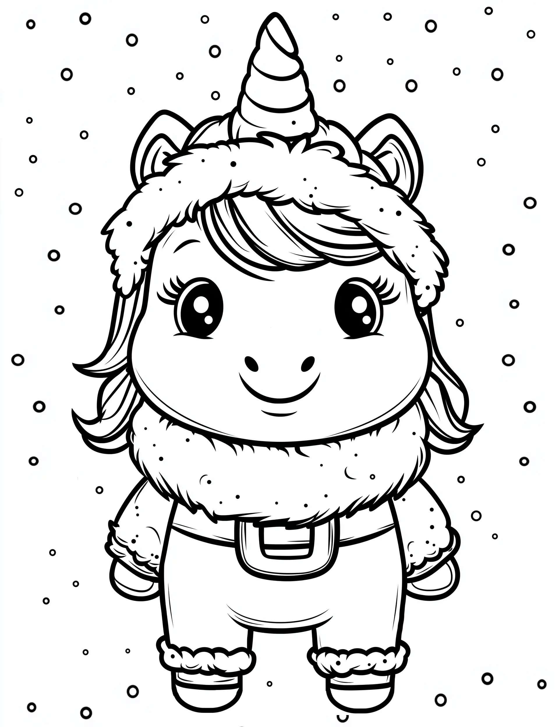 Santa-Inspired Unicorn in Winter Outfit with Snowy Background Coloring Page