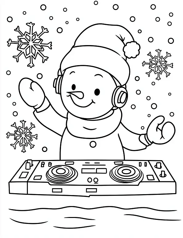 Add festive fun with a unique coloring page of a snowman DJ in a magical winter wonderland.