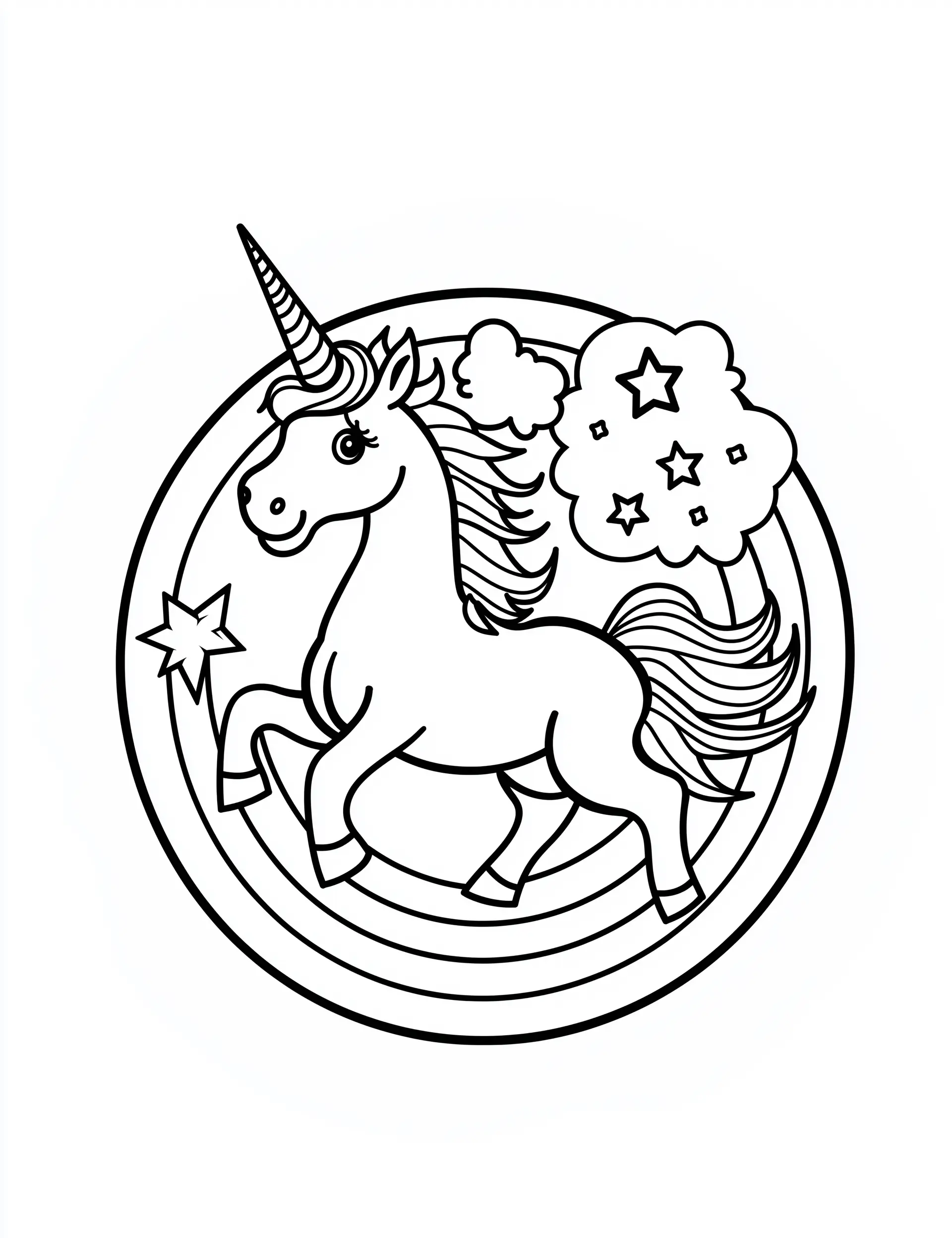 Unicorn in Rainbow Circle with Stars Coloring Page