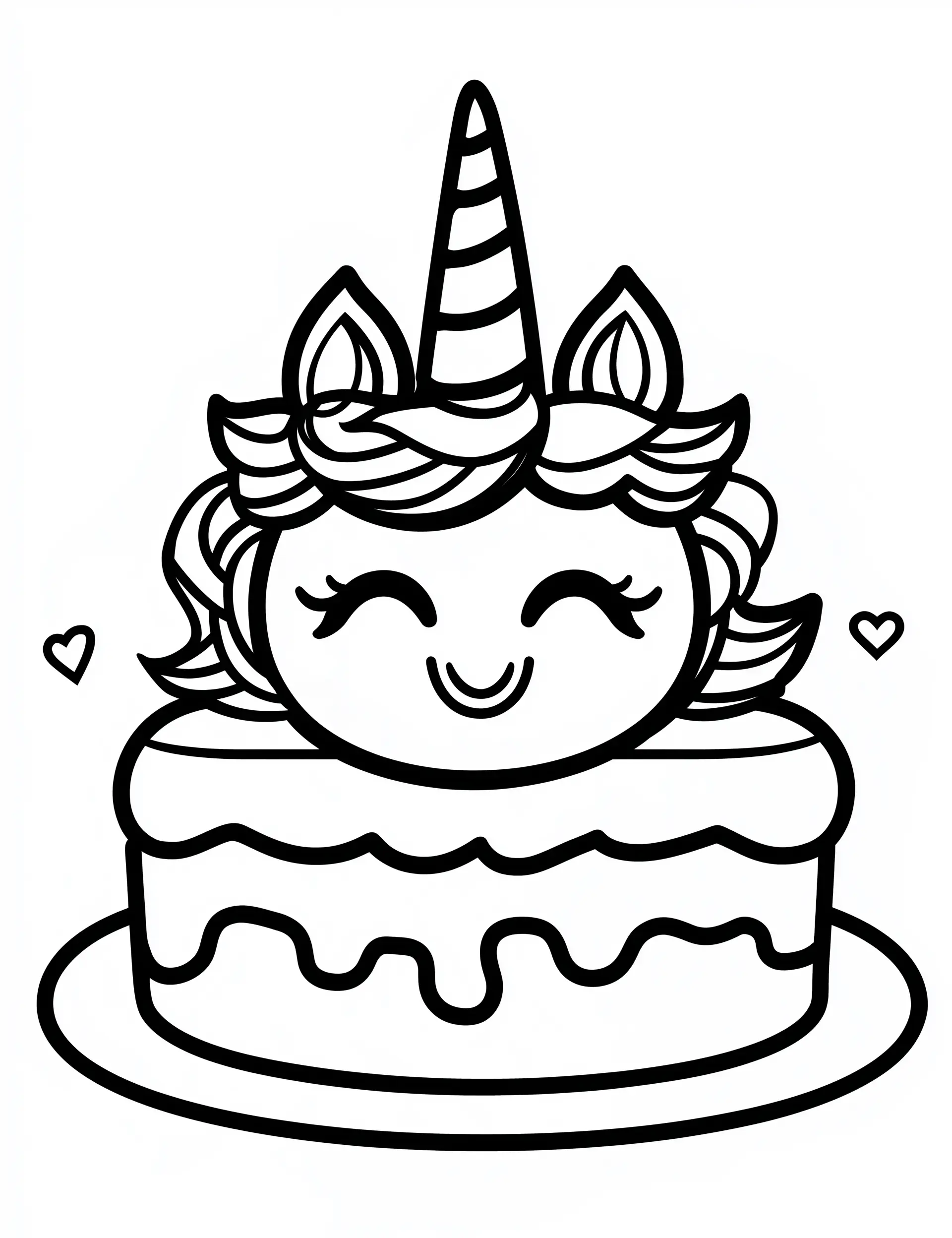 Unicorn-Themed Birthday Cake with Kawaii Style Coloring Page
